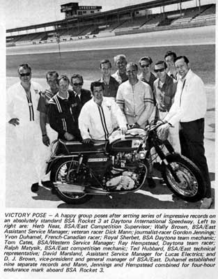 Don again: To kick off the BSA campaign, I got an agreement from AMA president, Bill Berry, to officiate record attempts with the Rocket 3 at the Daytona Speedway. We leased the Speedway April 2 through 5, 1969, and hired Dick Mann, Yvone Duhamel, and Ray Hempstead for long-distance speed record attempts. These attempts were being made because our service manager, Herb Nease, told me he thought the new bike could go as fast as 130 mph if it was set up carefully to exact factory specifications. That got my attention because I respected Herb's opinion on such matters. | |||||||||||||||||||||||||||||||