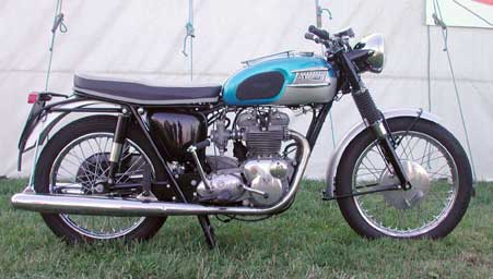 It is not generally known that in 1965 the first of the new triples looked like a normal Triumph. This early prototype was on display at Beezumph in 2003. Check out the nice, sandcast cylinders and heads. Had this machine been brought into the US, American riders would have been very happy. For some reason, management went to outside, "professional designers". | |||||||||||||||||||||||||||||||||||||||||||