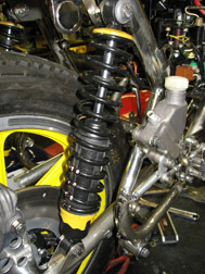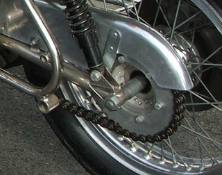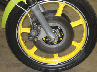Tom Lester cast the aluminum wheels, especially for my racer. Derek also made this 1" longer swingarm. I raced with S&W shocks.
