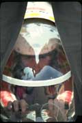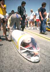There were very strict rules for this contest. But the idea for going fast, as always, was to minimize the frontal area, keep it aerodynamically slippery and minimize rolling resistance. For good handling, you must also keep the weight as far up front as possible. Of course, it was required that you had brakes. We used a parachute and skuff pads that rubbed on the road (aero space and wagon wheel technology). | ||||||||||||||||||||||||||||