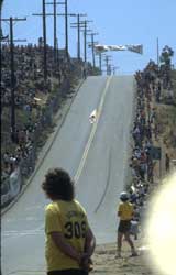 Signal Hill is very steep. The picture does not do it justice. At the bottom is an intersection of another road with a hump which could launch the faster boards into the air and cock them sideways. If you were not exactly in the center of the road, you would go head first into the curb. Many contestants and skateboards were shattered there. | ||||||||||||||||||||||||||||