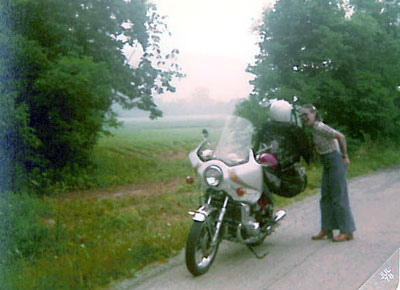 | Another Vintage shot from 1974 Carol, the decals came today, thanks for the "T" shirt and patch, too. Attached is a shot of my (when new) 1974 Honda CB650-four. I lived in Florida at the time and was able to ride year-round. The second picture is of the 2004 Guzzi Stone which I modified an old '73 Guzzi bracket to fit. I'll send you a nicer picture of it this summer when the trees have greened. | |||||||||||||||||||||||||||||||
