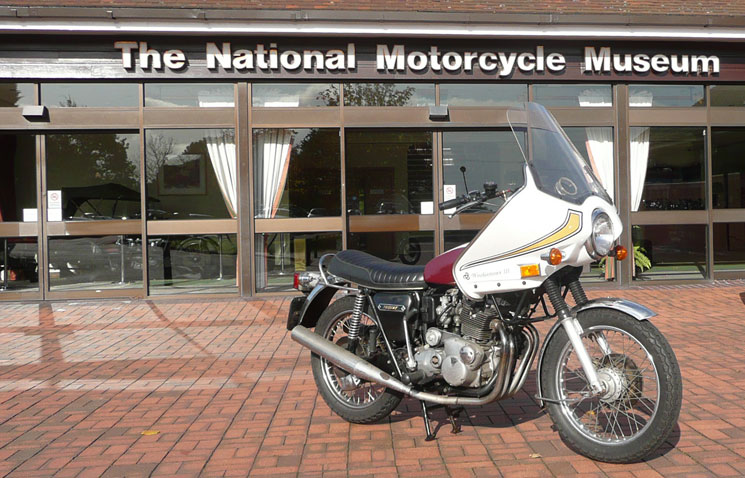 | Here is a rare sight: A Windjammer on a Triumph T-160 in England. See the (Bonneville TT/T-160 story) This belongs to my friend, John Young, one of those crazy English Triumph Triple people that I have grown to love. There could not have been more than 25 Vetter Trident brackets made, but John found one! And, he put a "period correct" Windjammer 3 on it. John writes: "The serial number is "09-119832". The date sticker (assume date of finishing or dispatch maybe) reads June 23 1976 and is in the inside of the right hand compartment. Is that "anorakish" enough for you?" The phrase "Anorak" is a distinctly English phrase, refering to people like John who love details. Well, John, has made me realize that I too am somewhat of an Anorak. For example, on June 23, 1976, when his fairing was being made, I lay, attatched to my bed in traction in Gainsville, Georgia from injuries to my hip and pelvis from racing at Road Atlanta. We'll talk more about Anoraks later... | |||||||||||||||||||||||||||||||