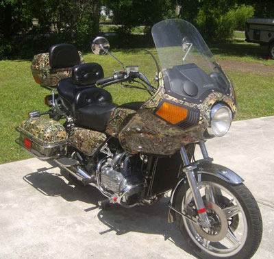 ![]() | Hey Mr Vetter, Here's my 1979 GL1000 with 50,000 miles. Its sporting a Vetter Windjammer fairing with Bates saddlebags.The paint job is a Mossy Oak Graphics Vinyl sticker. I just got back from an awesome ride to Fontana Dam/ Deals Gap and the fairing rode smoothly at 80 mph + even though its 30 years old! Its a unique ride that always gets attention! Thanks again for such a great product! Pat "Papito" Meyer | ||||||||||||||||||||||||||||||