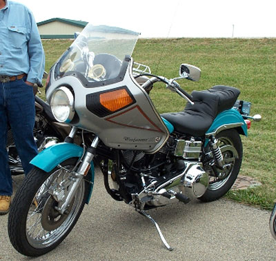 | Hi Carol: A few years ago I was given a 1971 Harley Superglide basket case. I e-mailed Craig a few times to get some needed information, and promised him that I would send him a picture once I got it all back together. Attached to this e-mail is a picture of it from the 50th anniversary celebration at Pierce Harley Davidson this past summer (2007). The fellow standing next to it trying to ignore it is not me. It sure stands out among all the other custom Harleys around here. It is a whole lot of fun to ride. I was going to put the Vetter bags on it too, but they wound up on the 1977 Guzzi I-Convert LAPD along with yet another Windjammer and the rear trunk. Thanks again for continuing to support your old products. Steve Berg | |||||||||||||||||||||||||||||||