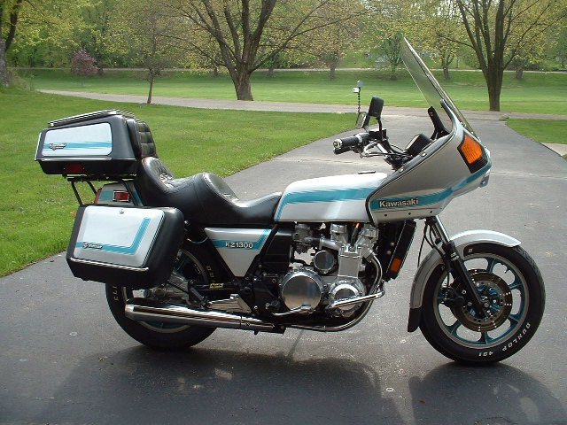 | Vetter Corp. sold a complete outfit like this to Kawasaki Motor Company in 1980 The KZ1300 was so wide at the tank, that the rear mounting hole of the Windjammer had to be cut away. New mounting bolt holes were added in front of the fork tunnel. Gene, however, made his own brackets. Very impressive. | |||||||||||||||||||||||||||||||