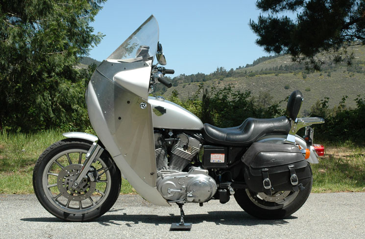 Jeff says: "I like the Alcan fairing on the cruiser..looks sharp, very ultra modern." Kevin has an 1100 V-Star. He writes: "I like the possibilities! My older body likes the cruiser feel but I HATE the buffeting and how it wants to steer the bike on it's own. This looks to address the issues while giving some great protection from the elements. I would certainly like to see how the pricing and overall fit (pics around the bike - V-Star) looks. I do believe there is a market for this type of solution. After getting into the cruiser style bike I found (unfortunately too late) the numerous postings on the very problems I am looking to solve. Is this going to become a real possibility soon? I am a definite interested party. Without solutions such as this I may either end up with a convertible or going back to more traditional touring style bikes with the full fairing." | ||||||||||||||||||||||||||||||||||||||