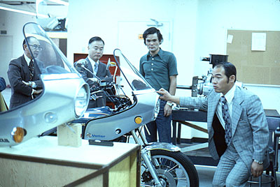 Early in 1975, Honda delivered their fairing and the first three production GL1000s to Illinois. (A red one, yellow and turquoise) We spent the next year converting their technology for fairings (SMC) to our technology (Vacuum-formed ABS). Honda engineers came in from Japan regularly to follow our work. | |||||||||||||||||||||||||||||||||||||||||
