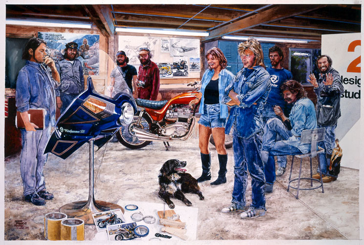 Spring of 1976, Rantoul, Illinois: “Where Motorcycle Dreams Were Made” The 1970s were heady years for motorcycling. At Vetter, we doubled manufacturing every year, and still had a hard time keeping up with the demand for Windjammers. We were always behind. One day in 1976 (memorialized in the John Marsh painting above) Carol, who then was in charge of Vetter Dealers, informed me that Honda customers were not taking delivery of their bikes until Windjammers were installed. If you were Mr. Honda, could you afford to let that happen? Clearly, it would be just a matter of time before motorcycles would come from the factories with fairings on them. Working with Honda on their “Hondaline” fairing would have helped us all but, a disastrous fire at Vetter in early 1977 destroyed the Hondaline molds. Although it was a minor setback for their production, it had become clear to Honda that their Hondaline fairing was not going to be competitive with the Windjammer. Honda quietly dropped the project. | |||||||||||||||||||||||||||||||||||||||||