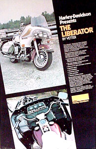 The Liberator began when I made a call to Harley-Davidson in 1973. "Would they like a big, frame mounted fairing for the FLH?" The answer was yes and a "Fit-up" bike was made available. I had the name all along. The "Liberator" was the plane my daddy was crew chief on in WW II. I loved that airplane. | |||||||||||||||||||||||||||||||||||||||||||||||||||||||||||||||||||