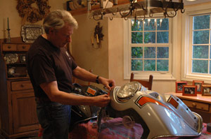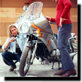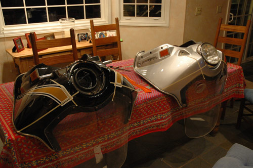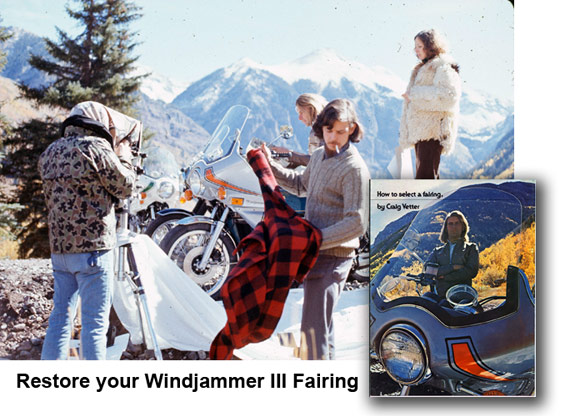 On the left: An original Windjammer 3, made between 1974 and 1977. About 75,000 Windjammer 3s were made... about half with optional striping. Stripes were reflective Scotchlite and could be ordered in gold (on the black windjammer, above) red, blue, green and orange. I always thought the orange on silver combination as I used for the turquoise 1975 GL1000 was the prettiest. | |||||||||||||||||||||||||||||||