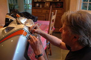 Study your original Windjammer 3 carefully and lay on the black tape exactly as it was done. Notice that the tripes are not the same thickness from beginning to end. Again, do not stretch the black striping, either. If you do, over time, the tape will want to creep back into a straighter line. | |||||||||||||||||||||||||||||||