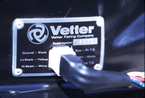 Of course, we made special side decals The first electrical plugs were 6 prong. The holes were hand-filed rectangles. Serial numbers were scratched into the fairing. Beginning November 1971, we Pop-Rivited aluminum plates onto the inside left side. These plates had serial numbers stamped into them. I got number 1000 for mine. | ||||||||||||||||||||||||||||||||||||||||||||||||||||||||||||||||