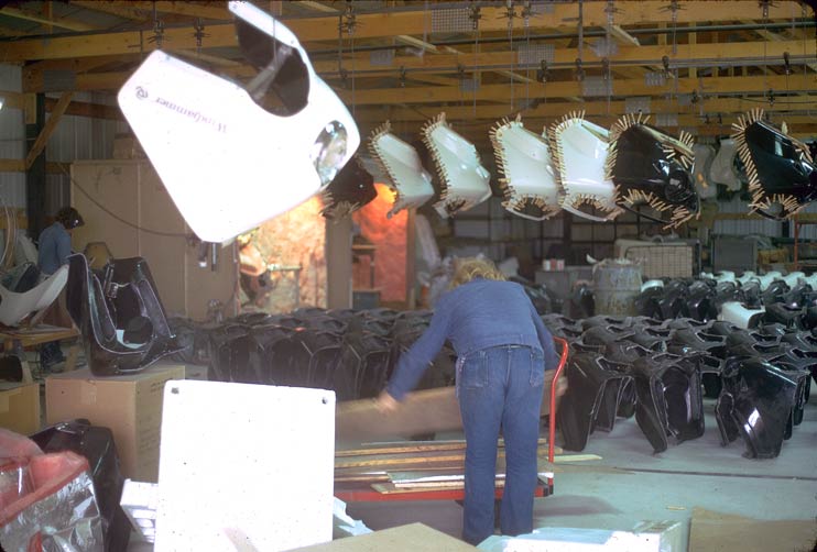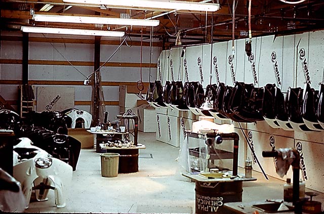 Not only did I design the fairings, I designed the factory, the jigs and fixtures and work stands, too. For the work stations, I recycled our 55 gallon drums, cutting them in half and filling them with sand. Each station operator was encouraged to customize his own. They could be slid around easily to be re arranged. These work stations were in continuous use thru the last days of Windjammer production. | ||||||||||||||||||||||||||||||||||||||