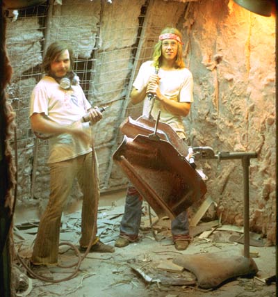 Did you know that your Windjammer was held together with clothespins while the glue hardened? You probably did not know that your Windjammer was routed (trimmed to shape) by Bob Nelson, aka "Johnny Rout" or Craig Coy, aka "CC Fairingwright" They played their air routers like musical instruments. To the left, Johnny Rout is "strumming" his router like Johnny Cash strummed his guitar. Almost everybody came directly out of highschool. Like me, they had never worked for anybody else. We made it up as we went. It wasn't hard. People rise to the ocasion when they are given the authority to do their job... even when they are only 18 years old. | ||||||||||||||||||||||||||||||||||||||