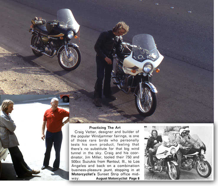 Bob Greene had been in motorcycling for a long time and was much respected. More than one person suggested that I meet him and show him what I was doing. Toruble was, he was in California and I was in Illinois. No problem. In May, Jim Miller and I rode out to meet him, doing the round trip in 10 days. Wow! This was in the middle of America's gas crises. Gas cost $.50 a gallon. While our political leaders allowed car owners to buy only a few gallons at a time on odd / even days, motorcyclists could buy all we wanted. This helped to make motorcycles popular. It made Windjammer Fairings popular too because Windjammers allowed riders to ride more. This was Jim's first and last long distance ride. He was happier cooridinating production at the factory in Illinois. I preferred to design and ride. We made a good team. As I recount this story I can't help but wonder: How did we do all this stuff? How could we move into a new building in a couple of days - and then... how could we afford to leave it to take an transcontinental motorcycle trip? How did we ride to California and back in 10 days? It boggles my mind. | ||||||||||||||||||||||||||||||||||||||